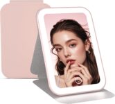 Kintion Travel Makeup Mirror, 16 * 10.8cm LED Portable Mirror with Lights, Rechargeable Light Up Mirrors, Dimmable 3 Colors Modes, Tabletop Folding Vanity Mirror for Handbag, Gifts for Girls, Pink