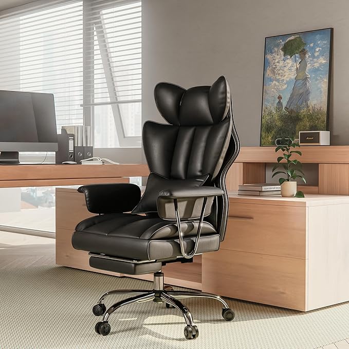 Product name : ALAULM Executive Office Chair, Leather Desk Chair with Telescopic Footrest, Ergonomic Office Chair with Lumbar Support, Height-Adjustable, Adjustable Backrest, PU Leather (Black)