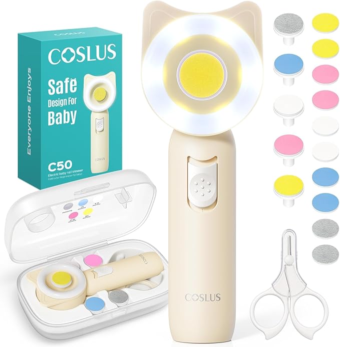 Product name : COSLUS Baby Nail File Electric: 16 in1 Safe for Sleep Trim Grind Gentle Baby Nail File with Quiet Design 360° Light 5 Grinding Heads 10 Adhesive Pads Suitable for Multiple Age Groups