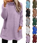 Fleece Jumpers for Women UK Teddy Fleece Longline Sweatshirts with Pockets Lightweight Loose Knitted Pullover Tops Plus Size Long Sleeve Winter Cosy Sweaters Half Turtleneck Plain Tunic Blouses