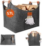 Log Basket – Extra Thick 4mm Wood Baskets for Logs, 57L Large Log Carrier with 15x18cm Double Pockets & Wooden Removable Handles, Felt Storage Bag for Shopping, Toy and Clothes