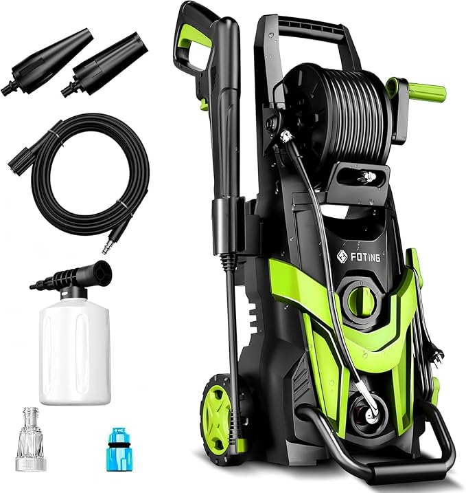 Pressure Washers, Pressure:max.145 bar, Flow Rate:420 l/h, Area Coverage: 50㎡/h, with Hose Reel, Foam Cannon and Adjustable Nozzles, High Pressure Washer for Cars, Fences, Patios and Driveway(Green)