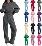 Womens Two Piece Full Set Pants, Long Sleeve Oversized Sweatshirt And Drawstrings Wide Leg Trousers Outfits Hoodie And Sweatpants Jogger Plain Set Ladies Gym Sports Activewear Sets S-3Xl